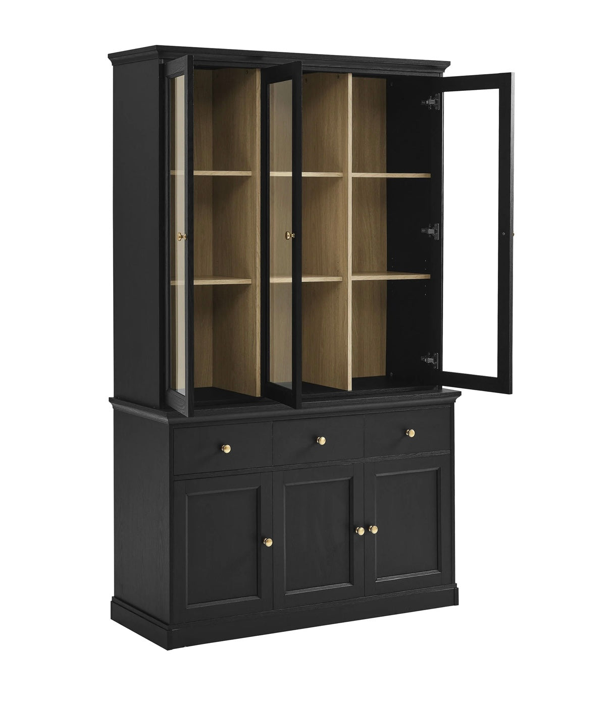 The Amara 79 Inch Large Storage Display Cabinet combines timeless style with practical organization, making it a versatile accent cabinet for the modern home. Three tempered glass doors with brass knobs open to nine shelf areas for displaying dishes, décor, or books, while three drawers and three lower cabinets with shelving provide convenient additional storage for everyday items. Crafted from a durable engineered wood blend with an attractive wood grain laminate interior, this tall cabinet also serves beautifully as a pantry cabinet, dining room buffet, or office credenza. With non-marking foot pins to protect floors, Amara is a modern storage cabinet that fits seamlessly into dining rooms, kitchens, living rooms, or workspaces. Assembly required. Weight Capacity: Top: 165lbs; Shelves: 198lbs each; Drawer: 66lbs; Lower Storage area; 264lbs each.