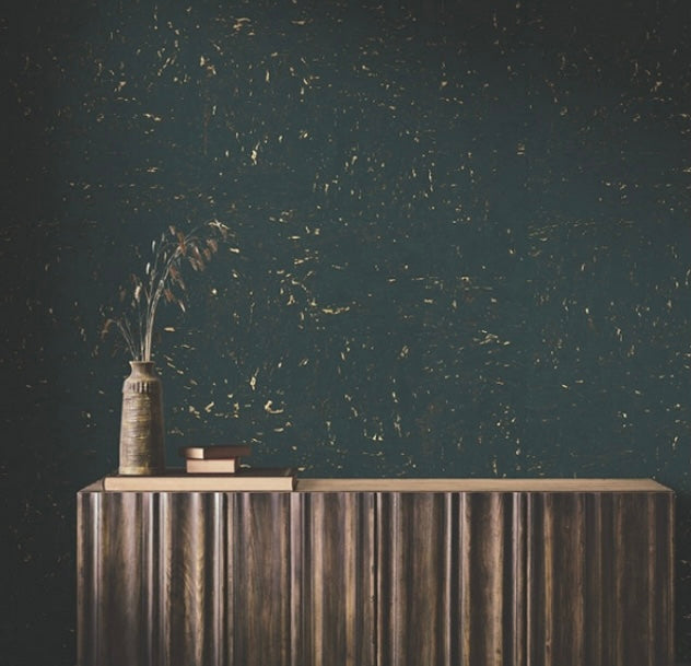 The famous cork oak forests of Europe and Africa provide the finest sustainable Caldera Cork for glamorous wall installations. Seen here in teal accented by rose gold metallics. This Caldera Cork Wallpaper measures approximately 36 inches wide by 24 feet long, measuring approximately 72 square feet per roll. A source guide, streamlined by the framework of color, provides a designer approach to distinctive specialties, naturals, grasses, woods, and luxury textiles. The affluent curation of exclusive designs highlights the best in handcrafting with organic materials.