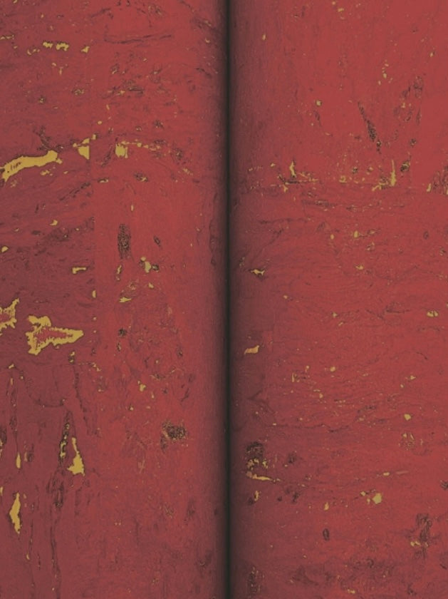 The famous cork oak forests of Europe and Africa provide the finest sustainable Caldera Cork for glamorous wall installations. Seen here in crimson accented by gold metallics. This Caldera Cork Wallpaper measures approximately 36 inches wide by 24 feet long, measuring approximately 72 square feet per roll. A source guide, streamlined by the framework of color, provides a designer approach to distinctive specialties, naturals, grasses, woods, and luxury textiles. The affluent curation of exclusive designs highlights the best in handcrafting with organic materials.
