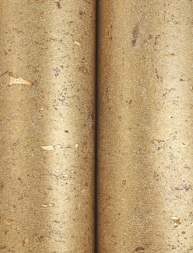 The famous cork oak forests of Europe and Africa provide the finest sustainable Caldera Cork for glamorous wall installations. Seen here in antique gold. This Caldera Cork Wallpaper measures approximately 36 inches wide by 24 feet long, measuring approximately 72 square feet per roll. A source guide, streamlined by the framework of color, provides a designer approach to distinctive specialties, naturals, grasses, woods, and luxury textiles. The affluent curation of exclusive designs highlights the best in handcrafting with organic materials.