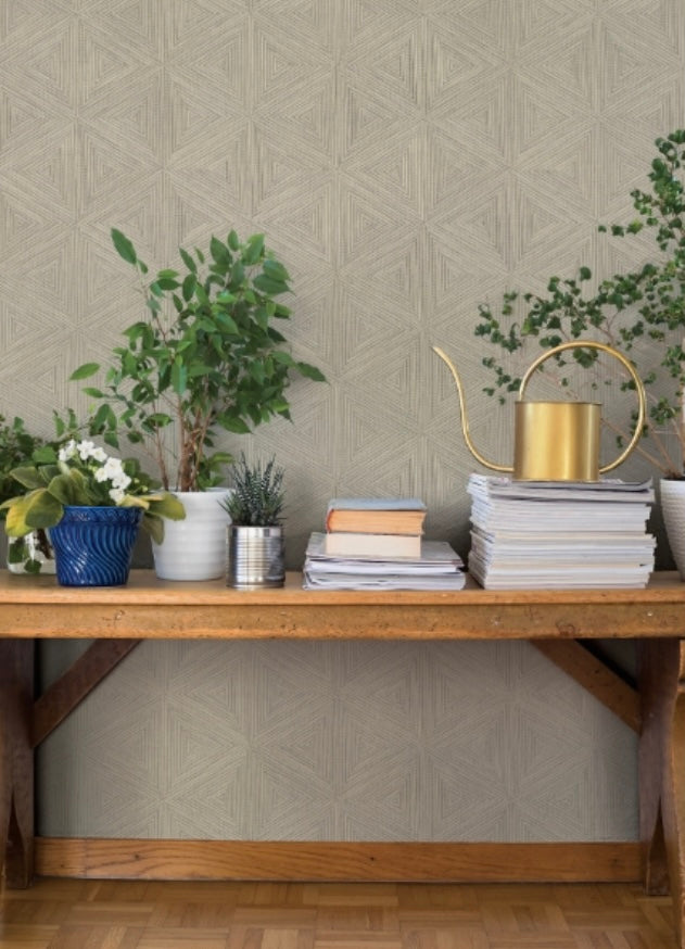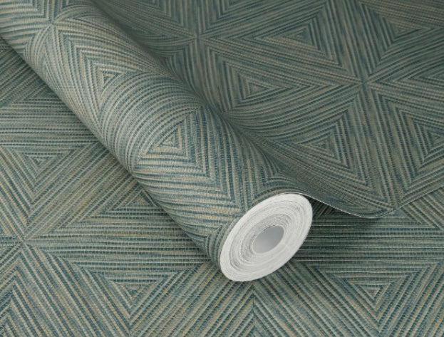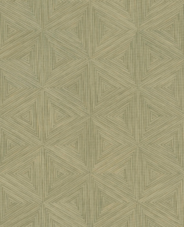 Rich with detail, this kaleidoscopic geometric is heightened by a faux grasscloth construction. Seen here in a jewel-like palette of green laced with cream and golden yellow. Anara is an unpasted, vinyl wallpaper measuring 20.9 inches wide by 33 feet long, covering approximately 57.5 square feet per roll.