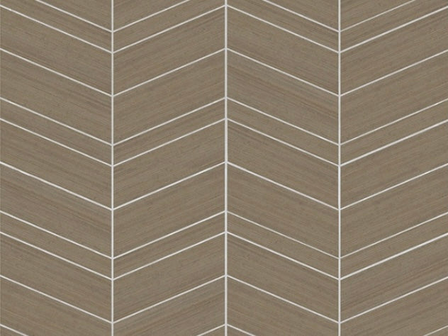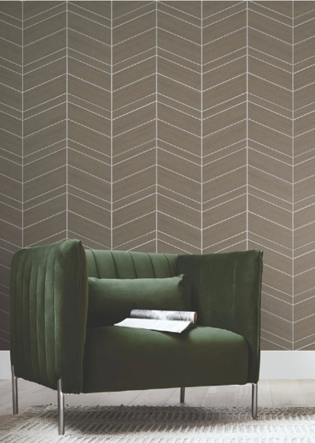 Angled strips of cut grasscloth form a modern geometric against a background of solid metallic foil in Chevron Abaca. Featured here in cinnamon with silver metallic. This Chevron Abaca Wallpaper measures approximately 35.8 inches wide by 24 feet long, measuring approximately 71.6 square feet per roll. A source guide, streamlined by the framework of color, provides a designer approach to distinctive specialties, naturals, grasses, woods, and luxury textiles. The affluent curation of exclusive designs highlights the best in handcrafting with organic materials.