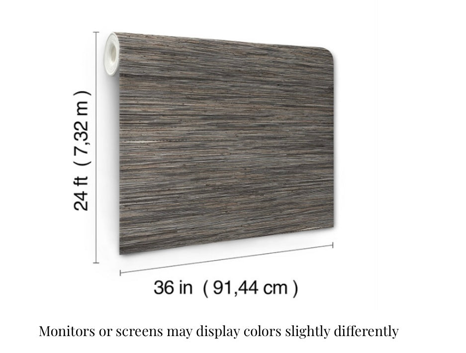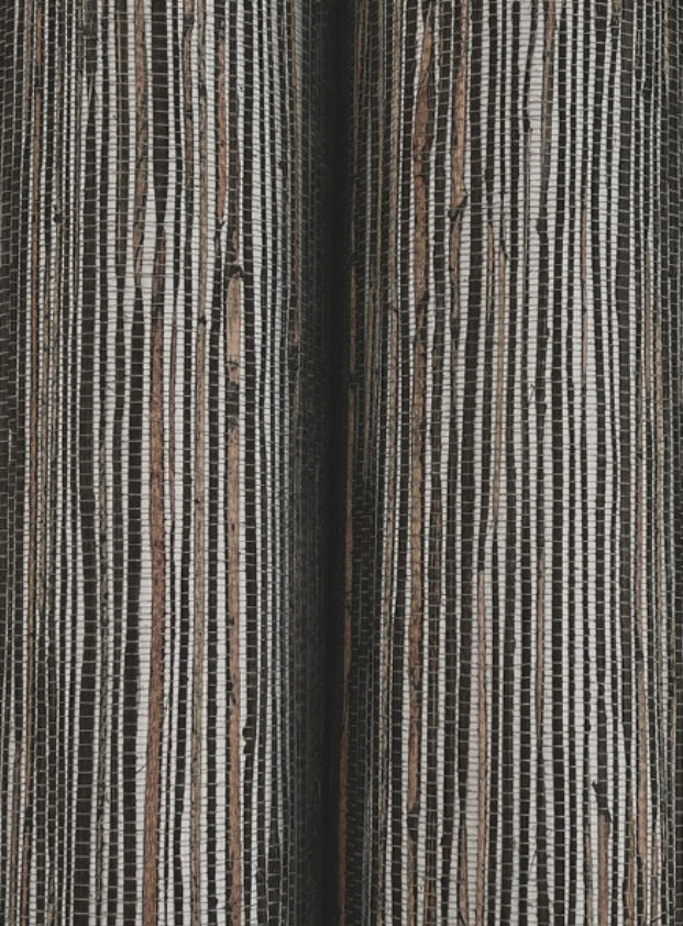 Natural hemp fibers create rippling, horizontal striations enriched by a burnished metallic backdrop in pattern Shimmering Hemp. Seen here in black, rich taupe, and metallic silver. This Shimmering Hemp Wallpaper measures approximately 36 inches wide by 24 feet long, measuring approximately 72 square feet per roll. A source guide, streamlined by the framework of color, provides a designer approach to distinctive specialties, naturals, grasses, woods, and luxury textiles. The affluent curation of exclusive designs highlights the best in handcrafting with organic materials.