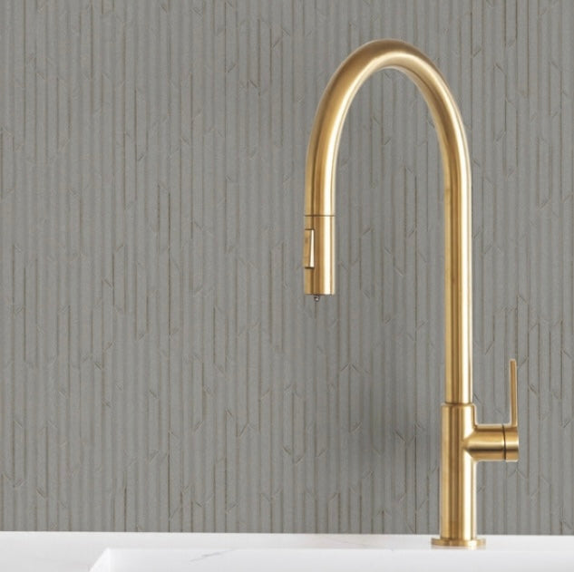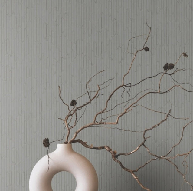 The diagonal pipes of a mechanical steam organ inspire the wide wales and diagonal slashes of the pattern Calliope, shown in pearlescent taupe brown. This Calliope Wallpaper measures approximately 26 inches wide by 30 feet long, measuring approximately 65 square feet per roll. Designed for function, industrial manufacturing’s unmistakable elements evolve to become the distinctive characteristics of a new philosophy of informal, modern sophistication of style.