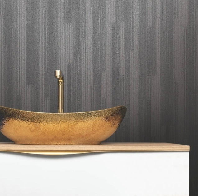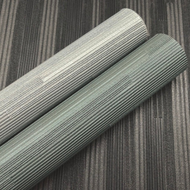 Thick and thin, deeply striated vertical lines and wide bars alternate and step out with mechanical precision in the stripe pattern Newel, shown in charcoal grey . This Newel Wallpaper measures approximately 26 inches wide by 30 feet long, measuring approximately 65 square feet per roll. Designed for function, industrial manufacturing’s unmistakable elements evolve to become the distinctive characteristics of a new philosophy of informal, modern sophistication of style.