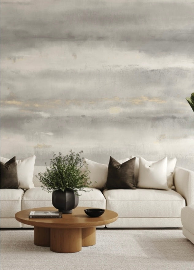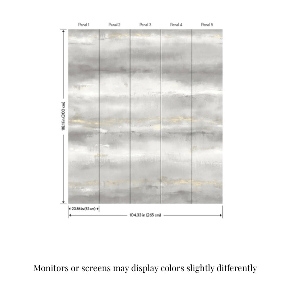 Enjoy organic elegance with this wall mural featuring wide washes of watercolor stripes accented by metallic striations. Featured here in a grey and white palette embellished with brushes of metallic silver. Aveline Grey Wall Mural comes on 5 panels that each measure 20.9-in by 117.6-in and 8.69-ft wide by 9.8-ft tall when assembled.