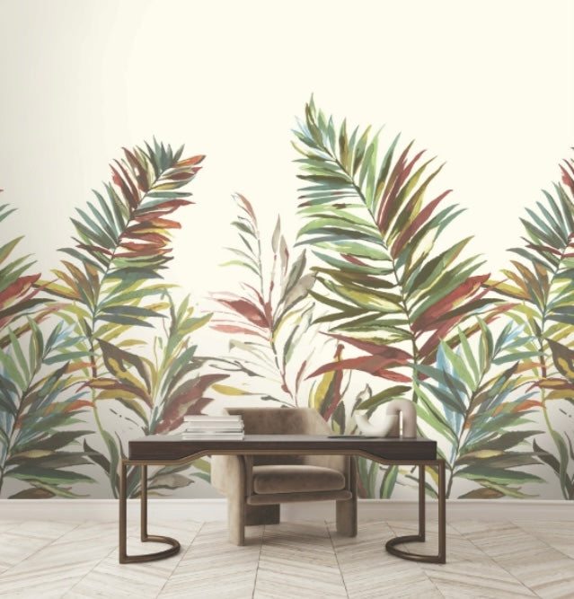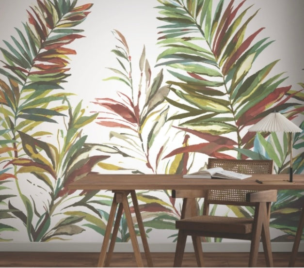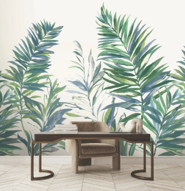 Swaying Palms Mural highlights the organic sophistication of lush, tropical palms by painting a cluster of fronds with decadent, artistic flair. Featured here in a palette of teal, indigo, lime, spring green, and beige/vibrant green and teal accented with rich red and oxblood hues. This Swaying Palms Mural measures 11-ft 1-in wide by 11-ft 2.4-in tall when assembled. The song of the forest echoes within the rich, earthen textures and greenery of this nature-inspired collection.