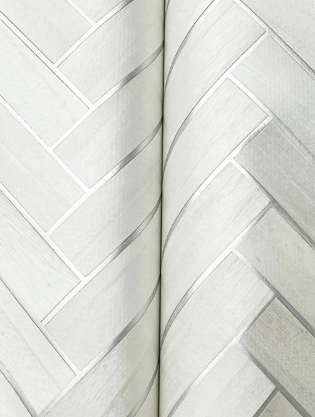 The classic suiting weave of Herringbone Wood Veneer creates a zig-zag brick effect in authentic wood, backed by burnished metallic foil. Featured here in apple blossom white and silver metallic. This Herringbone Wood Veneer Wallpaper measures approximately 35.8 inches wide by 24 feet long, measuring approximately 71.6 square feet per roll. A source guide, streamlined by the framework of color, provides a designer approach to distinctive specialties, naturals, grasses, woods, and luxury textiles. The affluent curation of exclusive designs highlights the best in handcrafting with organic materials.