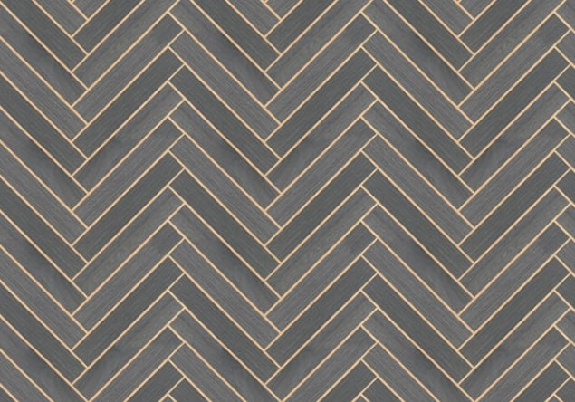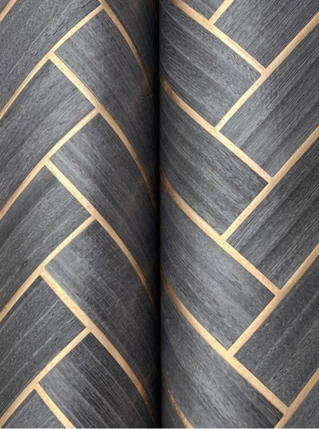 The classic suiting weave of Herringbone Wood Veneer creates a zig-zag brick effect in authentic wood, backed by burnished metallic foil. Featured here in graphite gray with antique gold metallic. This Herringbone Wood Veneer Wallpaper measures approximately 35.8 inches wide by 24 feet long, measuring approximately 71.6 square feet per roll. A source guide, streamlined by the framework of color, provides a designer approach to distinctive specialties, naturals, grasses, woods, and luxury textiles. The affluent curation of exclusive designs highlights the best in handcrafting with organic materials.