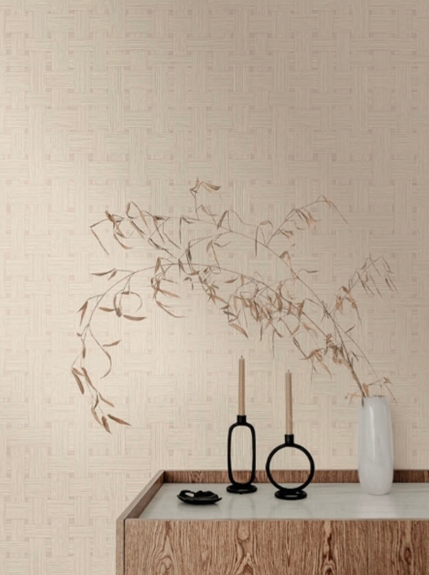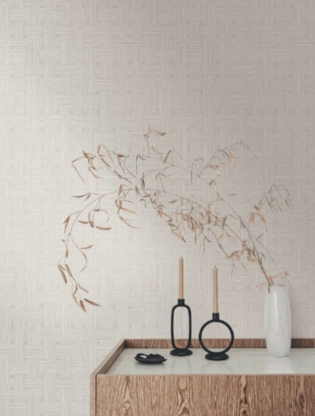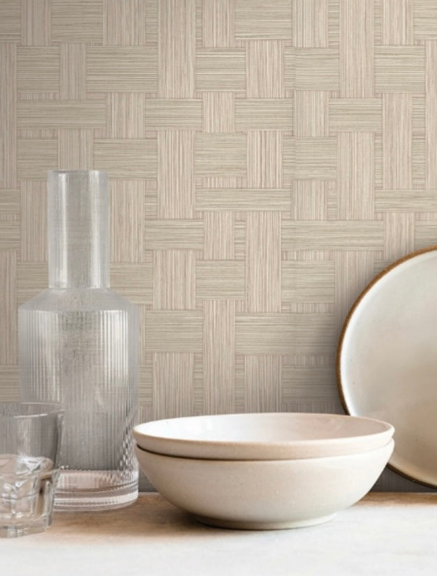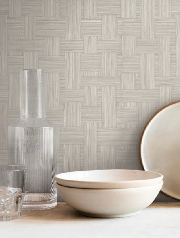 Basketry utilizes long strips of small, textural lines to form the structure of an oversized basket weave, melding artistry and craftsmanship. Basketry is an unpasted, vinyl on non woven wallpaper measuring 20.86 inches wide by 33 feet long, covering approximately 57.37 square feet per roll.